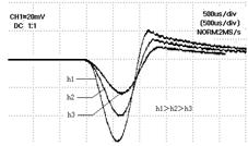 (3)對(duì)反射波檢測(cè)的關(guān)鍵技術(shù)錘擊進(jìn)行了研究,即激振脈沖寬度與錘頭材質(zhì)的彈性模量E成反比、與密度ρ、泊桑比σ成正比;與錘頭的面積成正比;與錘頭的落距關(guān)系不大,測(cè)試結(jié)果如圖1※。
